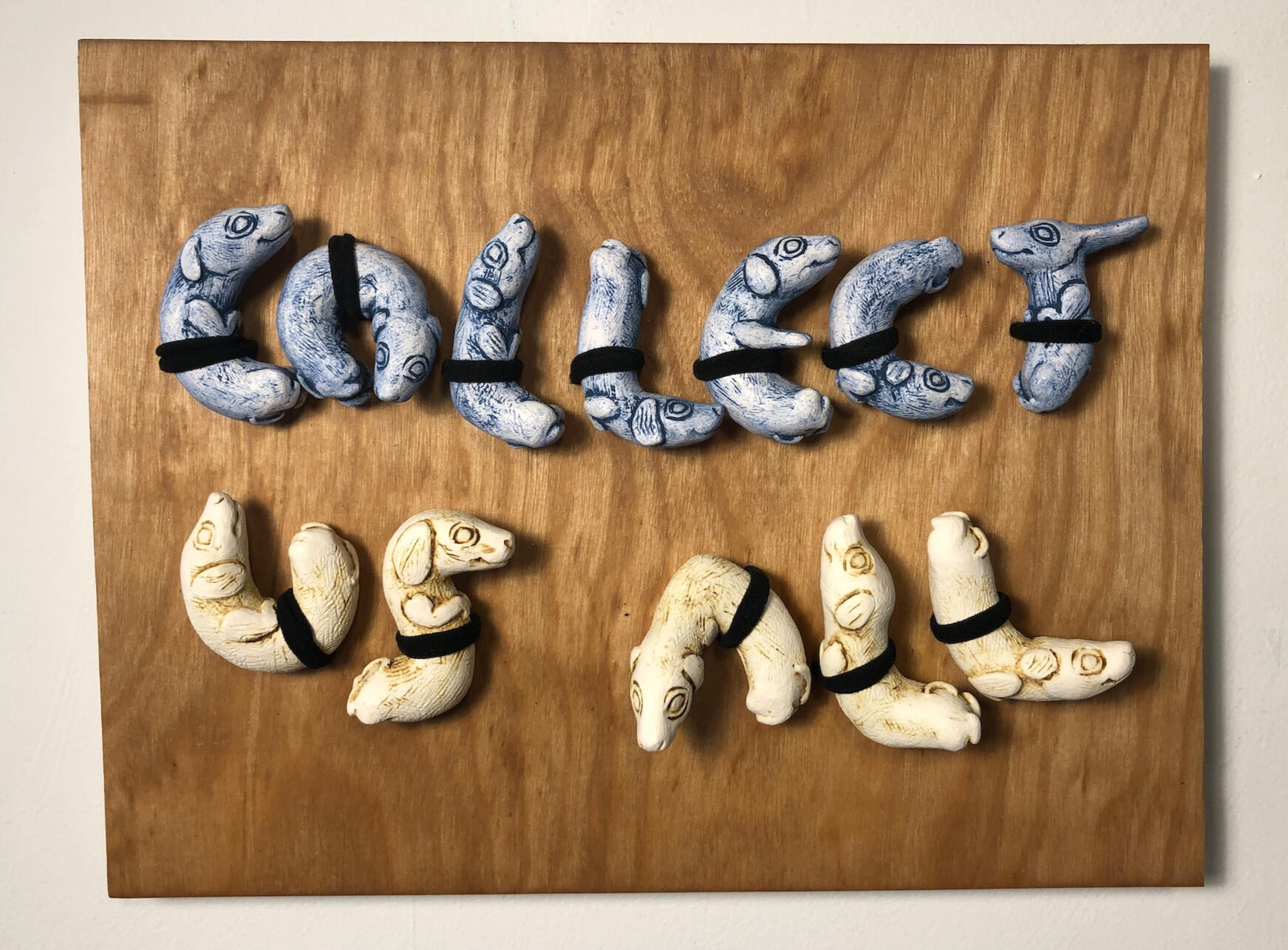 My studio practice explores ideas of collection, inclusivity, and othering, and my current work features small ceramic dogs. I use text in much of my work, and my small dog figurines have their bodies bent into letters, spelling out phrases in weirdly cute lettering. I construct board game-sized wall-hanging sculptures that become actual art playsets, including small ceramic dogs that can be removed from the original works. Sets of dogs can be joined and split, pieces lost and found. Each dog is its own small artwork, but also belongs to an original set or group. I use branding phrases such as “Collect Us All” and “Them/Us” in the work, inviting viewers into a potential transaction or situation involving personal choice and division.