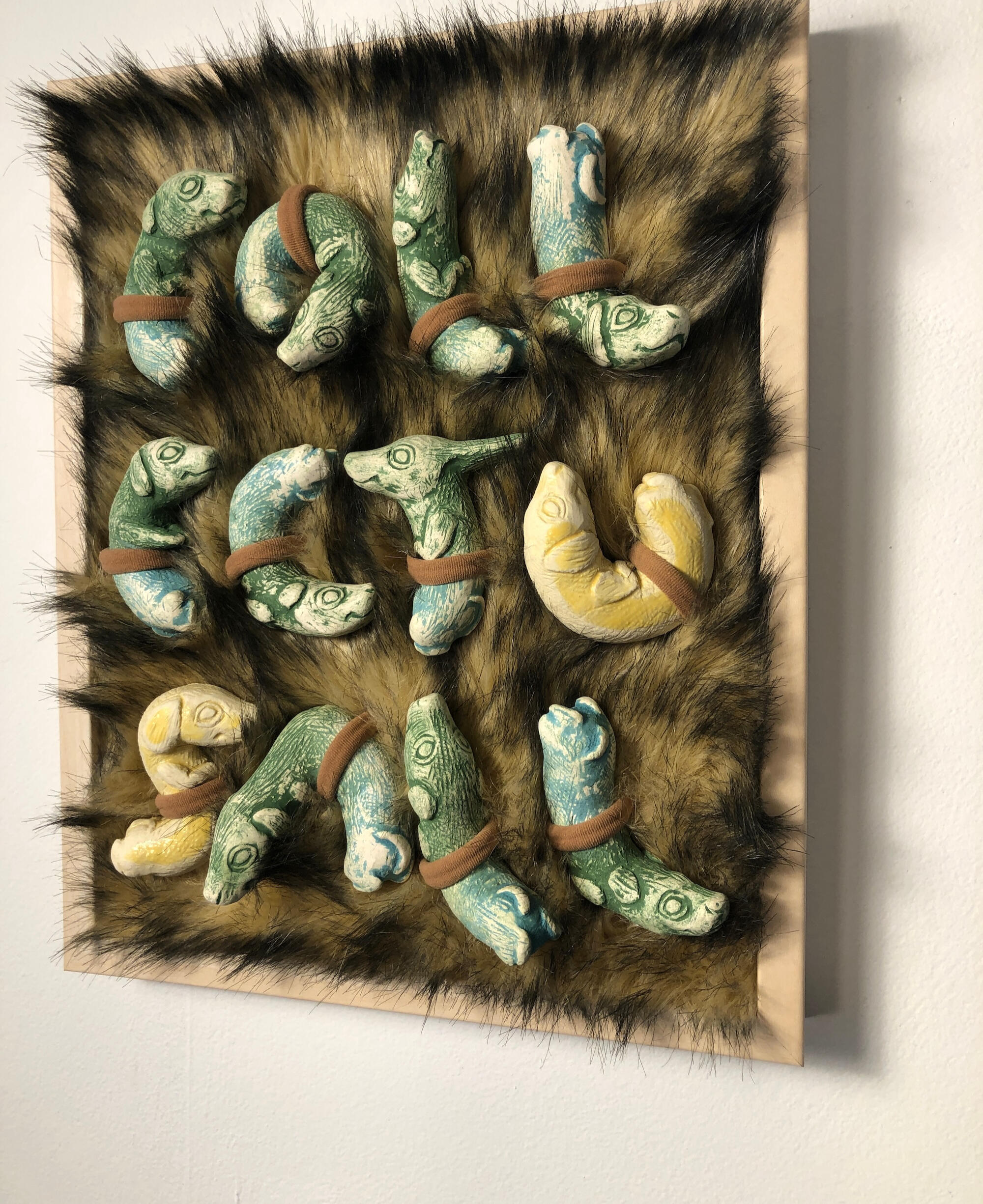 My family's neurodiversity influences my art, leading me to use sensory elements like fur and clay in my sculptures. My "Collect Us All" series features small, tactile ceramic dog figurines designed to be held and interacted with, doubling as worry stones or fidgets with detachable parts. These pieces are part of playful sets that encourage collecting and trading. I often sell these individually, leave them in public spaces, or gift them during studio visits.My "Them/Us" series explores themes of inclusion and exclusion, building on the ideas of collection and dispersion.